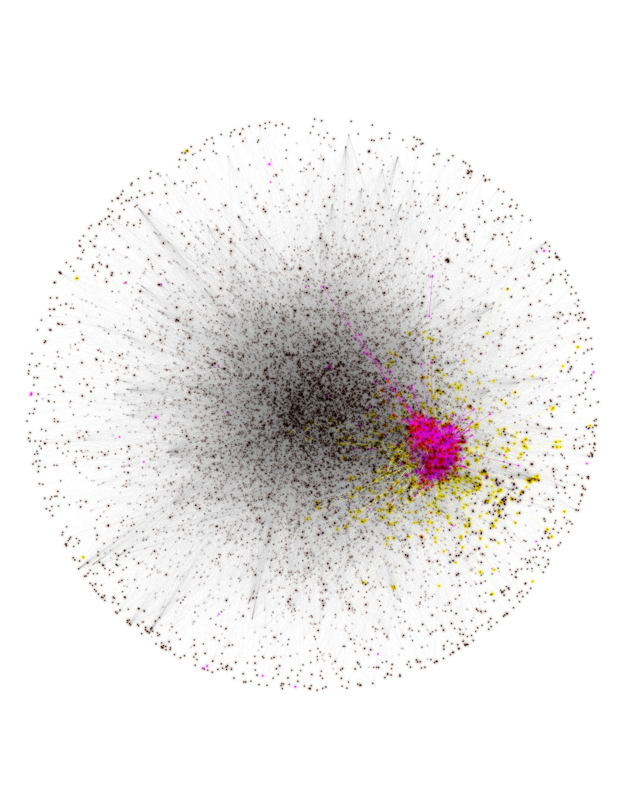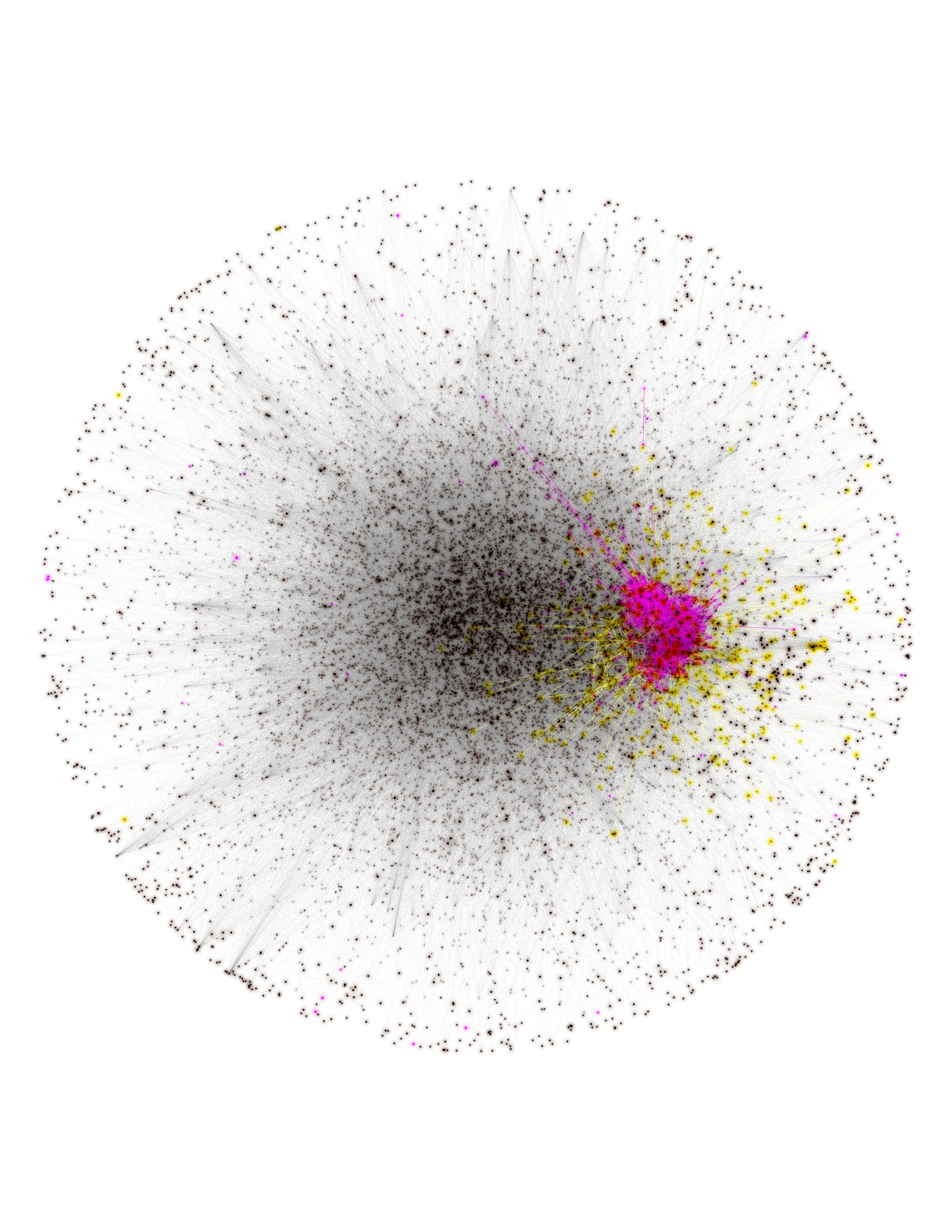 We used the same tools to identify the disease module of COPD (Chronic Obstructive Pulmonary Disease), shown with yellow on the map. COPD is a lung disease like Asthma, with many overlapping symptoms. Its disease module is in the neighborhood of Asthma. Not only are they in the same neighborhood, but the two modules show considerable overlap. Diseases that have similar symptoms should be located in the same part of the cellular network. By simply looking where various diseases are within this map, we can identify the molecular relationships between them.
