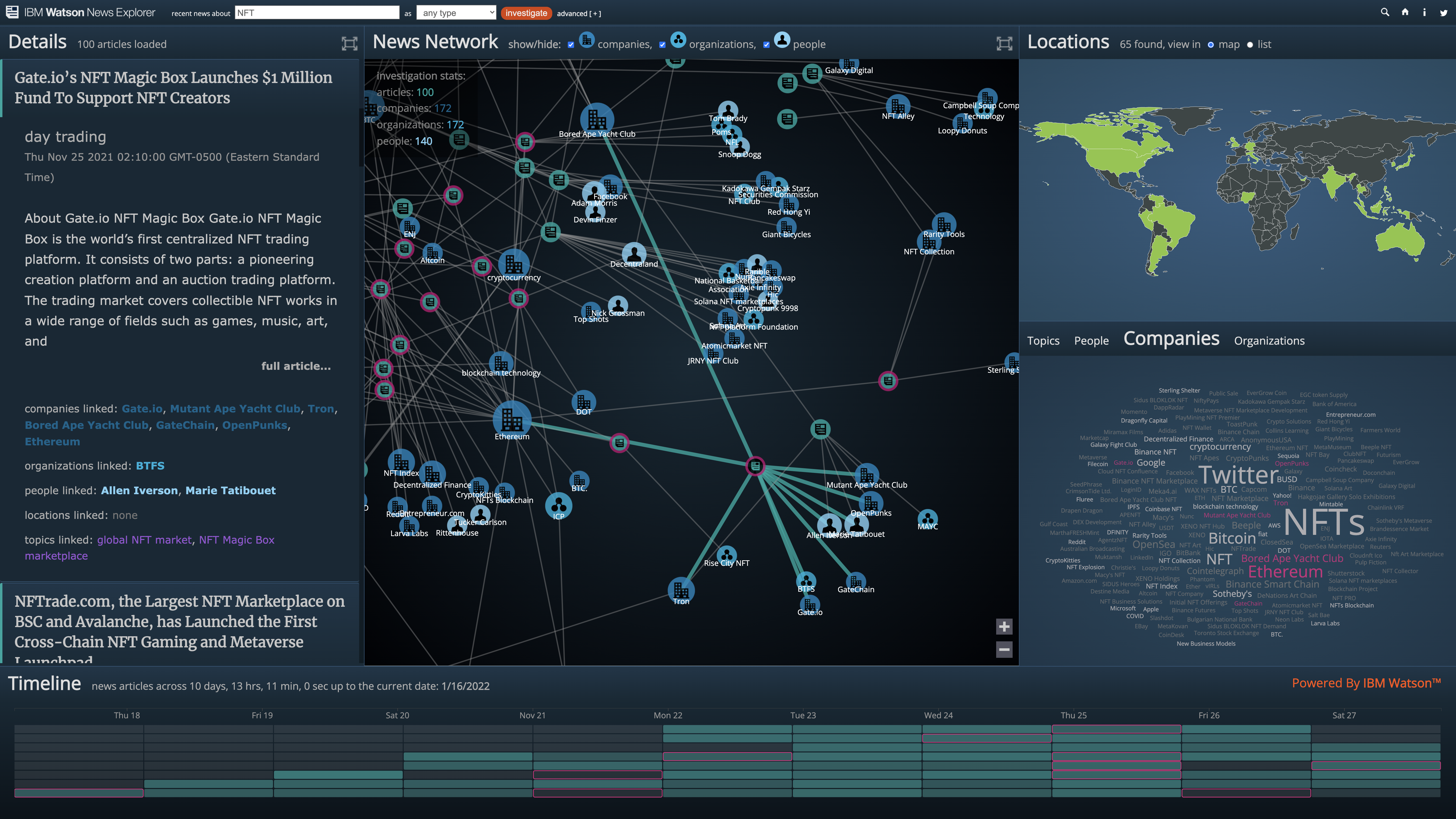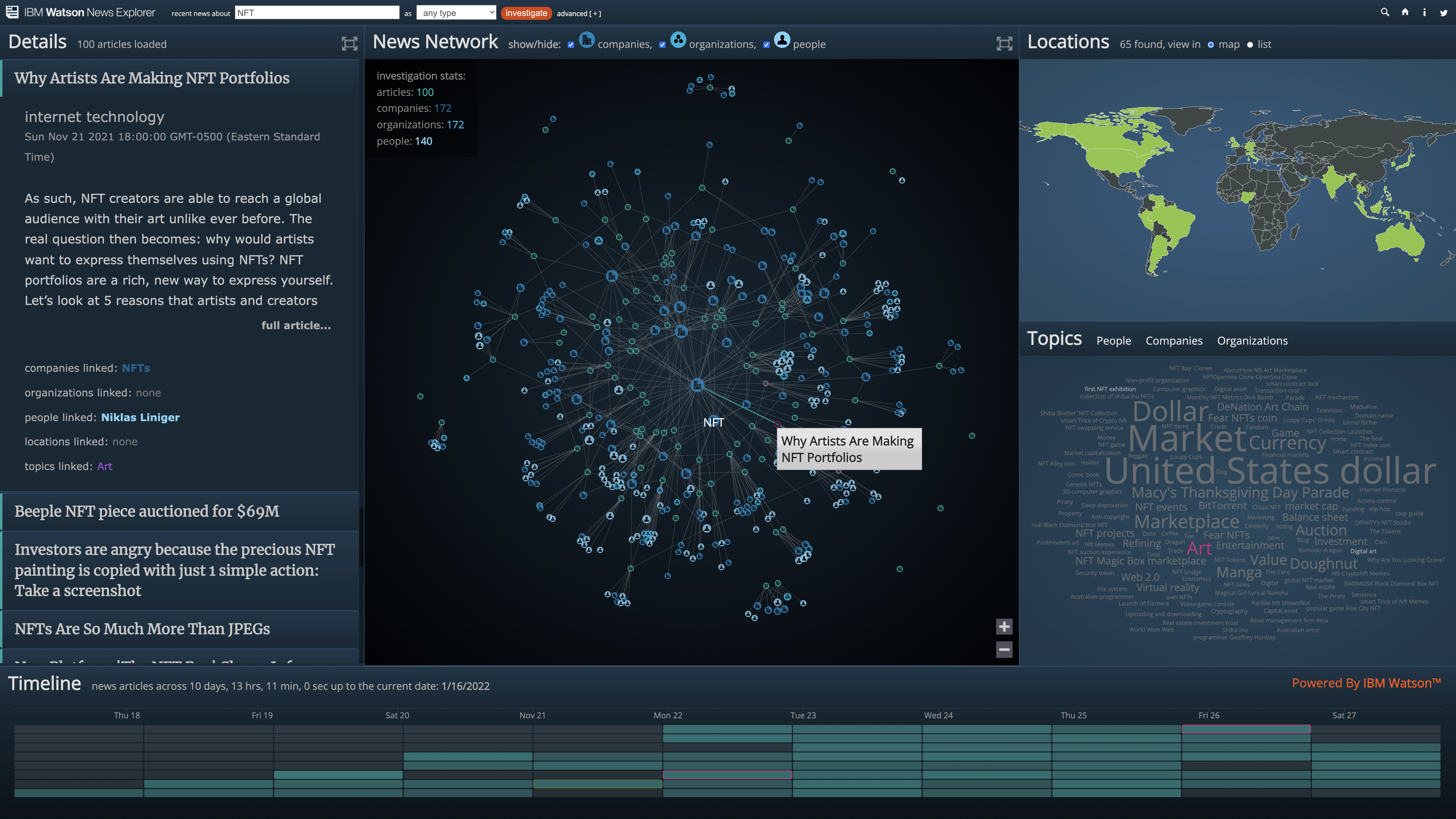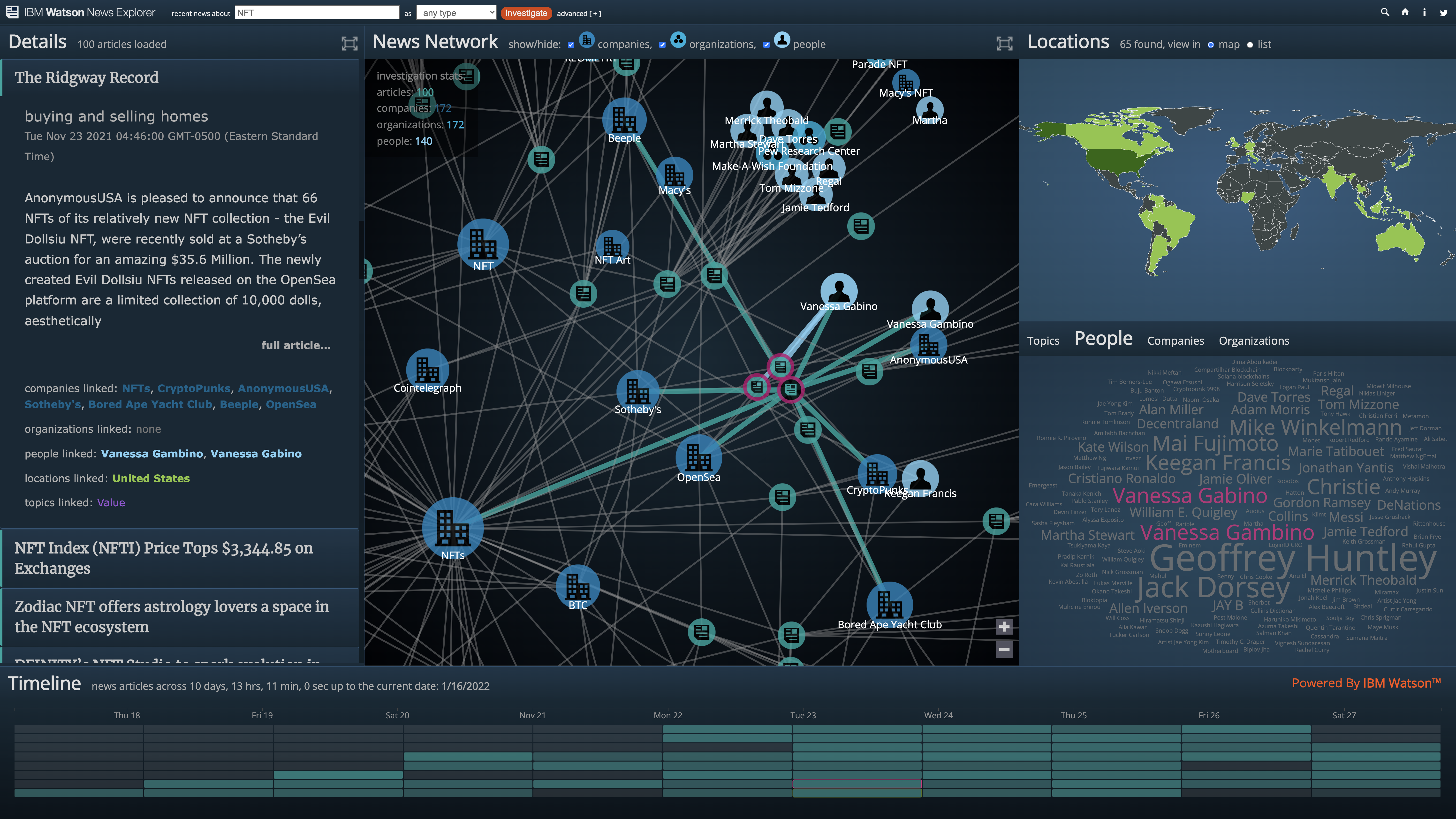 Watson News Explorer is an award-winning dashboard that allows users to explore the themes surfacing across the news ecosystem. By leveraging IBM Watson's natural language processing capabilities, the tool automatically constructs information networks from news data, revealing hidden connections between stories, people, organizations, and locations.