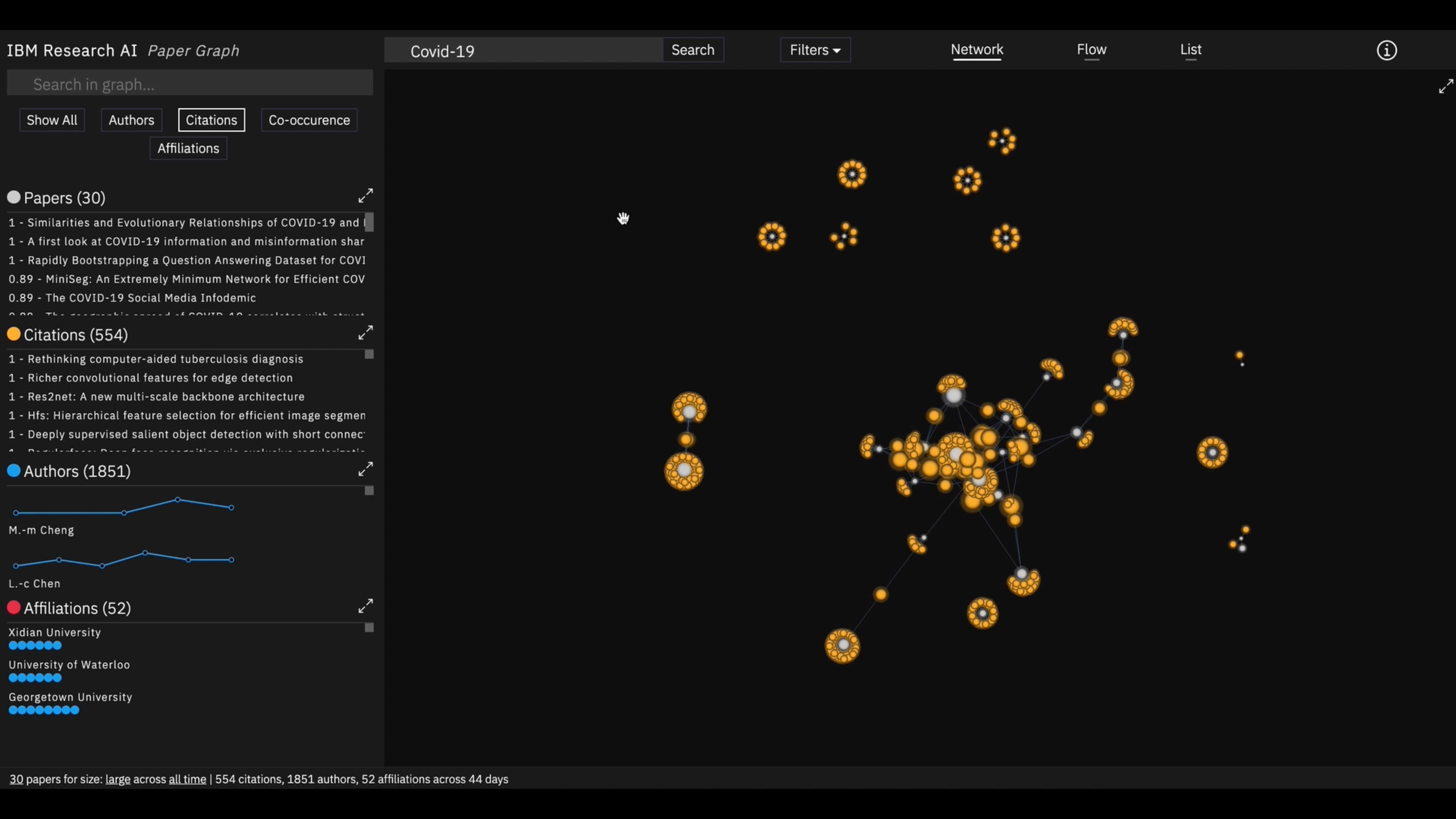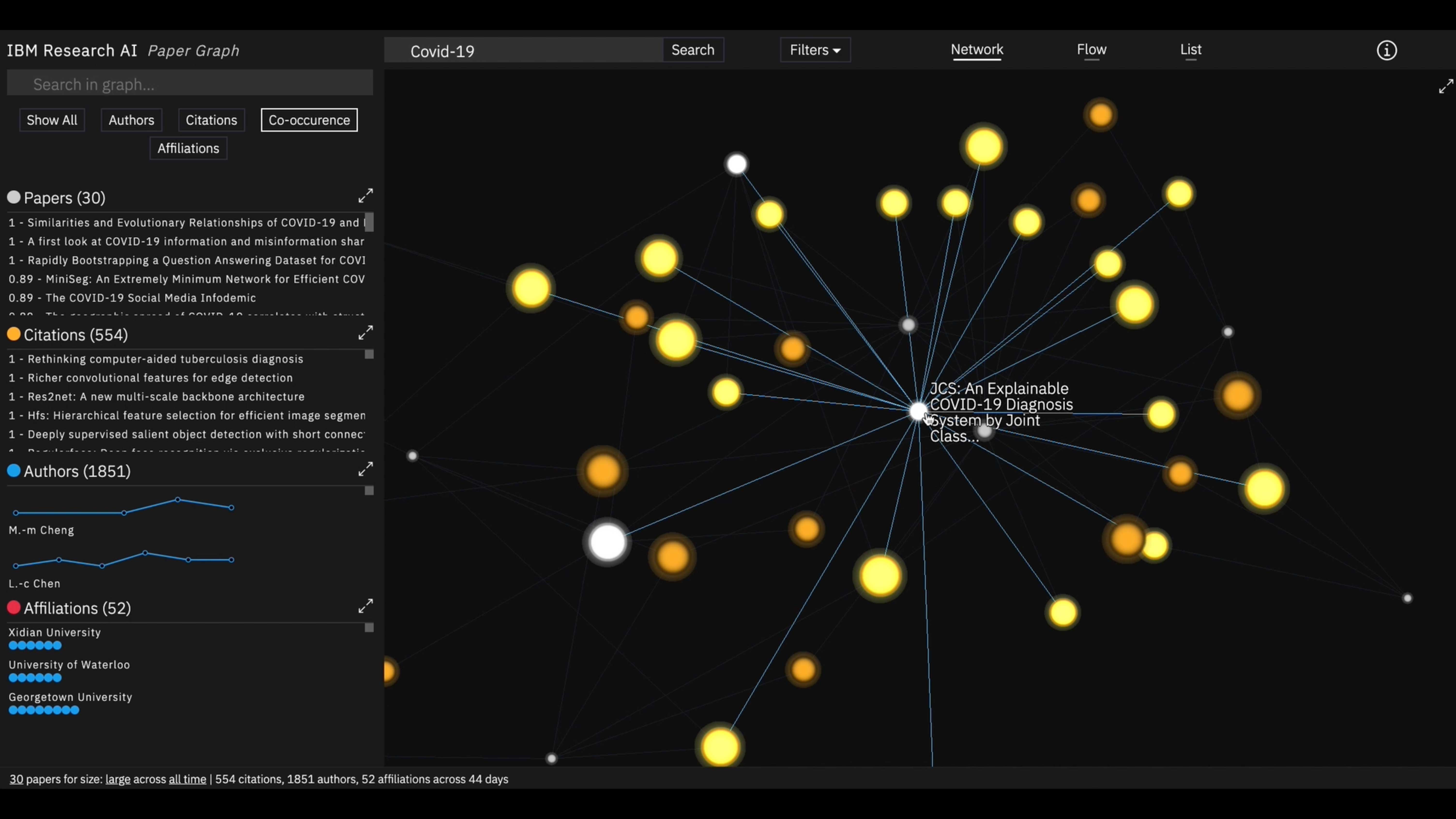Paper Graph offers multiple visualization modes to explore research from different angles. Users can switch between citation networks, author collaborations, co-occurrence patterns, and knowledge flow views, each revealing different aspects of how scientific ideas develop and spread.
